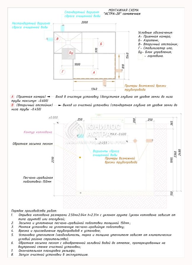 Прежде всего, необходимо понимать, что Юнилос Астра 20 – достаточно тяжелое изделие, вес которого превышает полтонны. Поэтому для монтажа установки потребуется использование специальной грузоподъемной техники или оборудования. Лучшее решение – установить септик, обратившись к услугам профессионалов. В нашей компании «СБМ-Групп» разработан четкий порядок последовательно выполняемого монтажа, что позволяет гарантировать высокое качество работы по доступной цене.